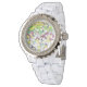 Esta bonita Relógio Branco Floral usa o Efeito Flutuante em uma foto original tirada de tulipas amarelas, laranja e cor-de-rosa no Ted Ensley Gardens.