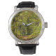 Uma caminhada na floresta em Somerset, no Reino Unido, capturada primeiro pela câmera fisheye, retrabalhada em estilo de pintura acrílico. O bosque via uma bola de cristal com todas as novas folhas de verde limão banhadas ao sol do primavera.