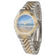 Este lindo relógio de pulso é perfeito para as férias de verão na costa. Pequenas ondas azuis rolam numa praia maravilhosa sob nuvens bonito. Eu adoro férias à beira-mar.