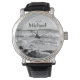 Este relógio apresenta uma bela foto em preto e branco de uma costa muito ondulada do Oceano Atlântico e um nome personalizável.