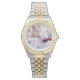 Um relógio de senhoras com uma fotografia de um gatinho gengibre sentado num chapéu branco e vermelho de Papai Noel. Luzes brilhantes turvas nos fundos. Rosto do relógio da arte deco.