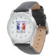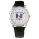 O relógio de homem personalizado, com pequenos números, mostra a bandeira francesa com a palavra FRANÇA abaixo em letras coloridas com o tricolor francês. Acima é um lugar para o seu nome ou outra pessoa, para que você possa criar um presente ou um olhar personalizado. Excelente de vestir a uma reunião de família. Legal presente para ele. Maravilhoso para o Dia da Bastilha.