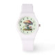 A watch with a cool illustration. Featuring a green frog sitting on a mound of grass. A big red mushroom sheltering him from the elements. A couple of little toadstools nearby.