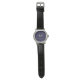 Front and back view of a wristwatch. The watch features a colorful geometric pattern on a blue dial, silver casing, and a black leather strap.