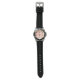 Front and back views of a wristwatch. The front features a colorful floral pattern on the dial with a black rubber strap. The back shows a silver case and engraved details.