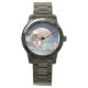 Relógio masculino com uma paisagem de fantasia mágica pintada com lua de cheio e lobo.