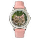 Um jovem adorável tabuleiro marrom Maine Coon gatinho sentado curiosamente num prado florescido em primavera. Uma foto fofa do gato-do-céu tirada por Katho Menden. Este relógio de pulso feminino com placa de discagem é uma ideia de presente para amantes de gatos.