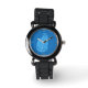 Assista em um Médio moderno século , design de gato retrô, em um padrão de fita abstrato - azul claro e azul médio, esboçado em azul marinho escuro, em um fundo azul de cobalto médio