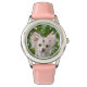 Um jovem cão Chihuahua, de cor branca, creme, de cabelos longos, sentado num jardim florescente, foto tirada por Katho Menden. Este relógio de pulso feminino com placa de discagem é uma ideia de presente para amantes de cachorros.