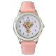 Um relógio com uma ilustração de aquarela branca apresentando uma face de girafa vestindo uma bonito coroa floral primavera. Colorida e fofa.