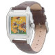 Relógio bonito de pintura de girassol laranja e amarelo para mulheres com uma tira de couro marrom clássica.