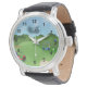 Este Golfing Watch apresenta um fundo de campo de golfe com uma armadilha de areia e uma bandeira de golfe, um carrinho de golfe vermelho, um carrinho de golfe azul ambos com bolsas de golfe. Texto decorativo é Golf. Os números de observação podem ser excluídos, se você preferir seu relógio sem eles. Presente perfeito para o golfista em sua vida. Escolha o estilo e a cor do seu relógio! Este design foi criado usando o trabalho de arte original em www.delightful-doodles.com
