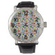 Este relógio masculino tem um design Bauhaus de uma grade com quadrados e retângulos em vermelho, verde, azul, laranja, azul claro, amarelo e vermelho.
