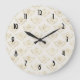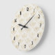 Um relógio com um padrão elegante, com biqueirão dourado em um padrão repetitivo em um fundo creme colorido.