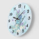 Este relógio bonito apresenta uma lata velha de água azul que é cheia de hidrópias e lilases. Um arranjo de lilases, margaridas brancas e pequenas bagas brancas cercam a lata. Duas belas borboletas estão se espalhando. Este relógio seria tão bonito numa cozinha com armários brancos ou talvez na sala de estar.