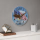 10,75 pol de relógio redondo de parede acrílica com uma imagem de uma bandeira americana ondulando e uma águia careca em voo contra um céu azul nublado. Veja toda a coleção Patriótica de Relógio dos anos 40 no DECOR | Seção Relógios.