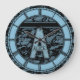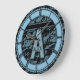 Este relógio tem uma letra azul "A" para alcie contra um padrão de renda preta.