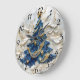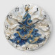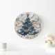 Um relógio bem trabalhado captura a essência do Natal, apresentando uma árvore festiva enfeitada com ornamentos azuis e dourados.