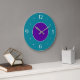 Um relógio simples com borda azul-turquesa e centro de círculo roxo. Este design de relógio colorido tem numerais e ponteiros prateados para combinar. Personalizável e disponível em formas redondas e quadradas.
