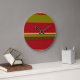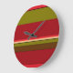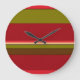 Este simples relógio de parede decorativo apresenta um padrão retrô-abstrato colorido de riscas geométricas ousadas em cores vermelho, laranja, marrom, verde-oliva, preto e bronzeado.