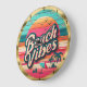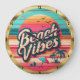 Este relógio de parede circular apresenta um fundo vibrante, listrado, parecido com tábuas pintadas de madeira, em tons de lacre, laranja, rosa e bronzeado, evocando um horizonte de pôr do sol. O texto em negrito e estilizado em branco diz "Beach Vibes". Silhuetas de palmeiras, guarda-chuva de praia, e aves voadoras completam a cena tropical, todas fechadas dentro de um quadro de ouro, estriado.