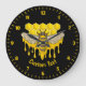 Abelha de mel com ícone de asas abertas sobre colmeia de abelhas e gotas de mel. Cor de fundo personalizada. Texto personalizado.