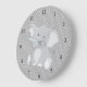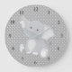 Este design de elefante giro é o tema perfeito para o berçário do seu bebê. Apresentando um elefante cinza em uma cinza e bolinhas branca de fundo, as mãos e os números do relógio também são cinzas. Faça seu pedido hoje!