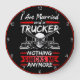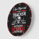 Este relógio ousado exprime com humor a resiliência de um motorista de caminhão casado. Apresentando um crânio branco flanqueado por dois caminhões-meias sobre fundo preto com jante vermelha, ele declara: "Eu sou casado e um CAMINHÃO NADA ME CHOCA MAIS". É um presente perfeito para o experiente motorista de caminhão que viu tudo. A ferramenta design também pode ser usada para adicionar texto personalizado se você quiser seu nome ou empresa neste relógio. Você pode personalizar a cor do quadro para qualquer cor que desejar, entrando na ferramenta design.