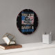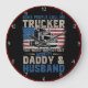 Este relógio de parede celebra a identidade multifacetada de um motorista de caminhão. Contra um fundo preto, ele apresenta um caminhão em semirreboque sobre um padrão angustiado de bandeira americana. O texto "ALGUMAS PESSOAS ME CHAMAM DE CAMINHEIRO O MAIS IMPORTANTE CHAMAR-ME PAI & HUSBAND" é exibido em fontes brancas e desbotadas de vermelho azul, destacando os valores familiares e o patriotismo ao lado da profissão de caminhoneiro.
