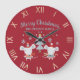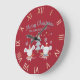 Este relógio festivo de natal apresenta um tema de inverno bonito sobre um fundo vermelho de burgundy. Uma imagem de dois ratinhos é ilustrada ao lado de uma árvore de Natal, sob luzes coloridas e flocos de neve. Uma saudação de "Feliz Natal" é impressa no topo, seguida de um nome de família de amostra. Você pode personalizar o relógio para incluir seu próprio nome personalizado ou texto. As horas são impressas em um design numérico ouro romano.