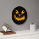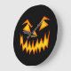 Uma cara de vista assustador da abóbora com olhos, o nariz e a boca alaranjados em um fundo preto.