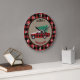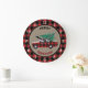 A fronteira neste relógio festivo de Férias é um padrão de xadrez de búfalos vermelho e preto. O interior tem uma faixa de círculo bronzeada com um carregando de xadrez vermelho e preto correspondente, uma árvore de Natal verde e recém cortada. O texto preto e vermelho acima e abaixo da imagem atualmente diz "Feliz Natal", mas você pode facilmente alterá-lo ou removê-lo, se quiser. Os números brancos facilitam a leitura do relógio. Uma bonita adição ao seu decoro de férias, e útil também!