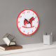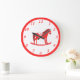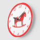 Este incrível relógio de natal apresenta uma imagem de arte digital de um belo cavalo de balanço estilo escandinavo. O cavalo é vermelho com um homem vermelho escuro, cauda e cascos. O cavalo amigável está sorrindo. Tem uma sela branca e rédeas com padrões bonito do estilo folk vermelho Scandi na sela, incluindo sol, lua e estrelas e corações e flores. A base do cavalo de balanço é vermelha e coberta de folhas brancas bonito. A design foi inspirada pelo cavalo sueco Dala.