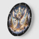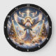 Um relógio redondo com um anjo impressionante cercado por árvores e presentes de Natal brilhantes, simbolizando a paz e a festividade, perfeito para decorações de férias e espalhando alegria sazonal em um design clássico.