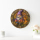 Vibrant harvest-themed clock featuring a purple-hatted gnome carrying red apples in a basket, surrounded by grapes, wheat, pumpkins and sunflowers. With gold numbers against a red barn background—perfect for farmhouse decor or Thanksgiving gifts.