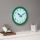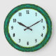 Este elegante relógio de parede interessante apresenta um quadro abstrato circular dramático de curvas verdes, azuis, indigo e amarelas ao redor de um centro de turquesa pálido. Os números podem ser apagados se for preferível um design mais simples. Este padrão funciona melhor nos relógios circulares.
