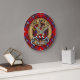 Crachá da crista Clan Leslie cercado por uma correia e fivela sobre fundo vermelho-tartan. Custom Text.
