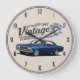 Esta é uma renderização de um carro clássico americano azul com gráficos de estilo vintage em segundo plano para um olhar retrô.
