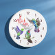 Três beija-flores coloridas cercam flores rosa-fuschia neste relógio bonito. As cores usadas com cor rosa são azuis, roxas, verdes e marrons. Os números marrons facilitam a leitura do relógio. Cheio para uma cozinha ou qualquer quarto!