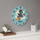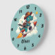 Este relógio personalizado e caprichoso apresenta um dinossauro fofo com chapéu de cowboy e cachecol aconchegante, enquanto domina um foguete espacial voador como um profissional. Estrelas brilham e nuvens fofas flutuam ao fundo.