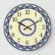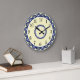 Belo relógio de cobalto azul e branco da cozinha com uma dica de amarelo. Mostrado em grande.