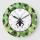 Este design de relógio de parede branca apresenta um padrão de grilos pretos colocados contra flores abstrato verde junto com um filme de críquete e algarismos verdes colocados contra um círculo branco. Em algumas culturas, pensa-se que esses insetos trazem boa sorte.