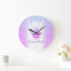 Make a stylish impression with this elegant, sophisticated, simple, and modern custom name wall clock. A sparkly, purple, pink, blue cupcake, script handwritten typography and glitter drips overlay a faux metallic champagne purple blue ombre background. Personalize with your full name, business, or other info. Your choice of a round or square clock face. Makes a chic, professional and fashionable statement in your kitchen or place of business.