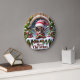 This charming clock features a cute elf with large pointed ears and a striped hat, peeking out from a snowy round window set into a rustic wooden wall. The window is framed by a generous wreath of pine boughs, holly, and red ornaments, with a sign below reading "Merry Christmas." The design may look real due to the high detail and three-dimensional texture in the artwork.