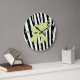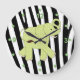 Um relógio de parede de criança bonito com desenhos animados como gráficos de um elefante verde e branco, contra um padrão de faixa de zebra preto e branco. Números e pontos que representam horas estão em verde. Relógio com excelente que irá adicionar uma decoração ao quarto do seu filho.