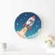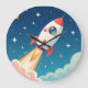 Cute red and white rocket blasting off in space with whimsical stars and clouds.