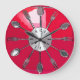 Hora da comida! Uma face vermelha e rosa do relógio feita de colheres e garfos. Que excelente é esse para um relógio de cozinha incrível! Veja a imagem da irmã azul 'Cutlery O'clock.'