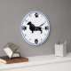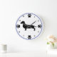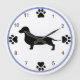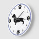 Um relógio de cachorro que apresenta a silhueta de um dachshund, com pegadas que marcam os números de quatro horas.