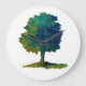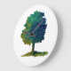 Uma árvore de sombreamento verde terroso em muitos tons, tem grama crescendo sob ela e está centrada no relógio que tem ponteiros pretos para indicar a hora.