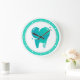 Um relógio profissional de parede dentária com uma imagem de dente para o consultório de um dentista, para o consultório dentário ou para o material dentário. Personalizado com suas informações sobre prática dentária.